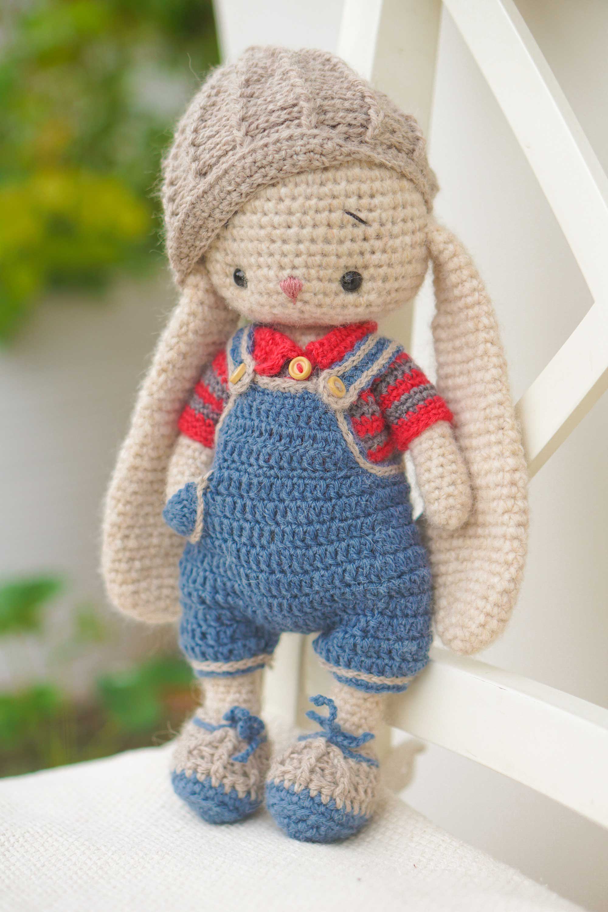 The baby bunny Boy has overalls, lovely hat, a t-shirt and boots