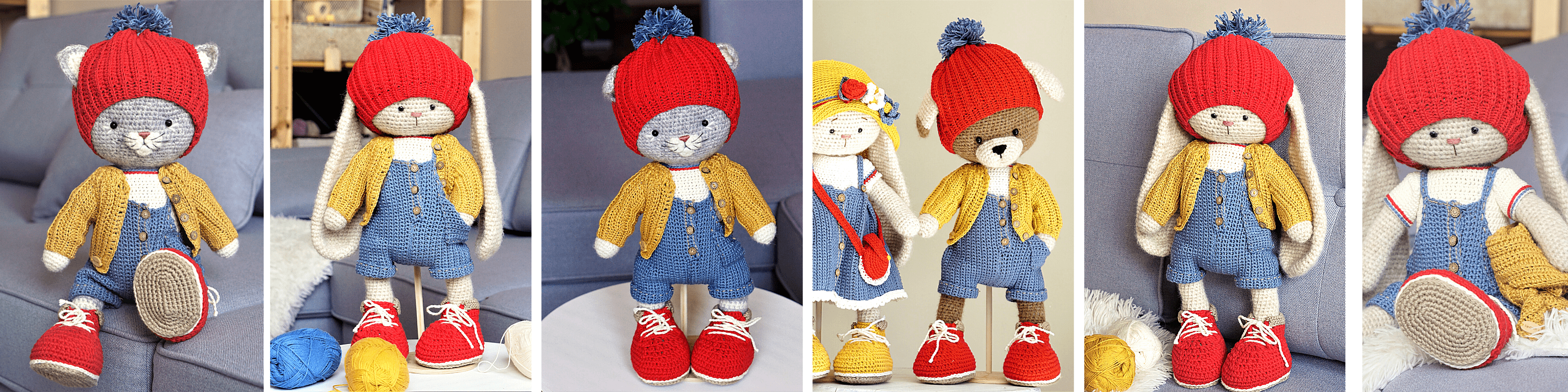 Crochet Patterns for: overalls; t-shirt; overalls; boots; jacket; hat.