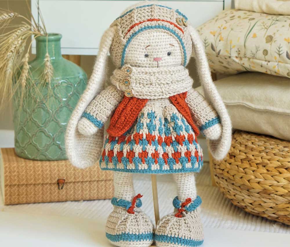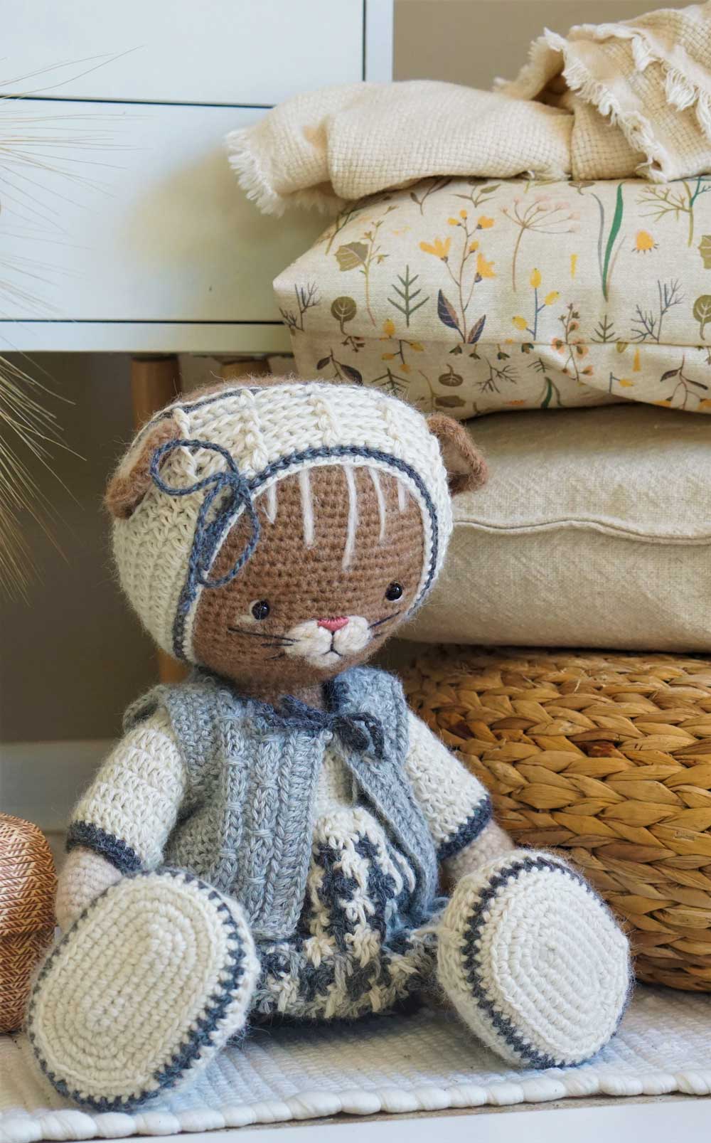 PATTERN INCLUDES: a long sleeve dress, panties, a vest, boots, a snood, a headband.