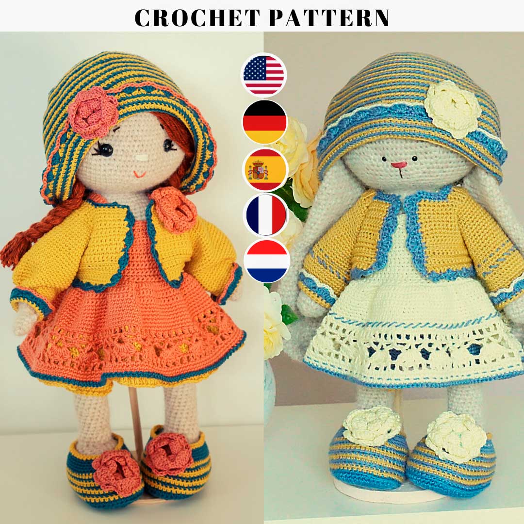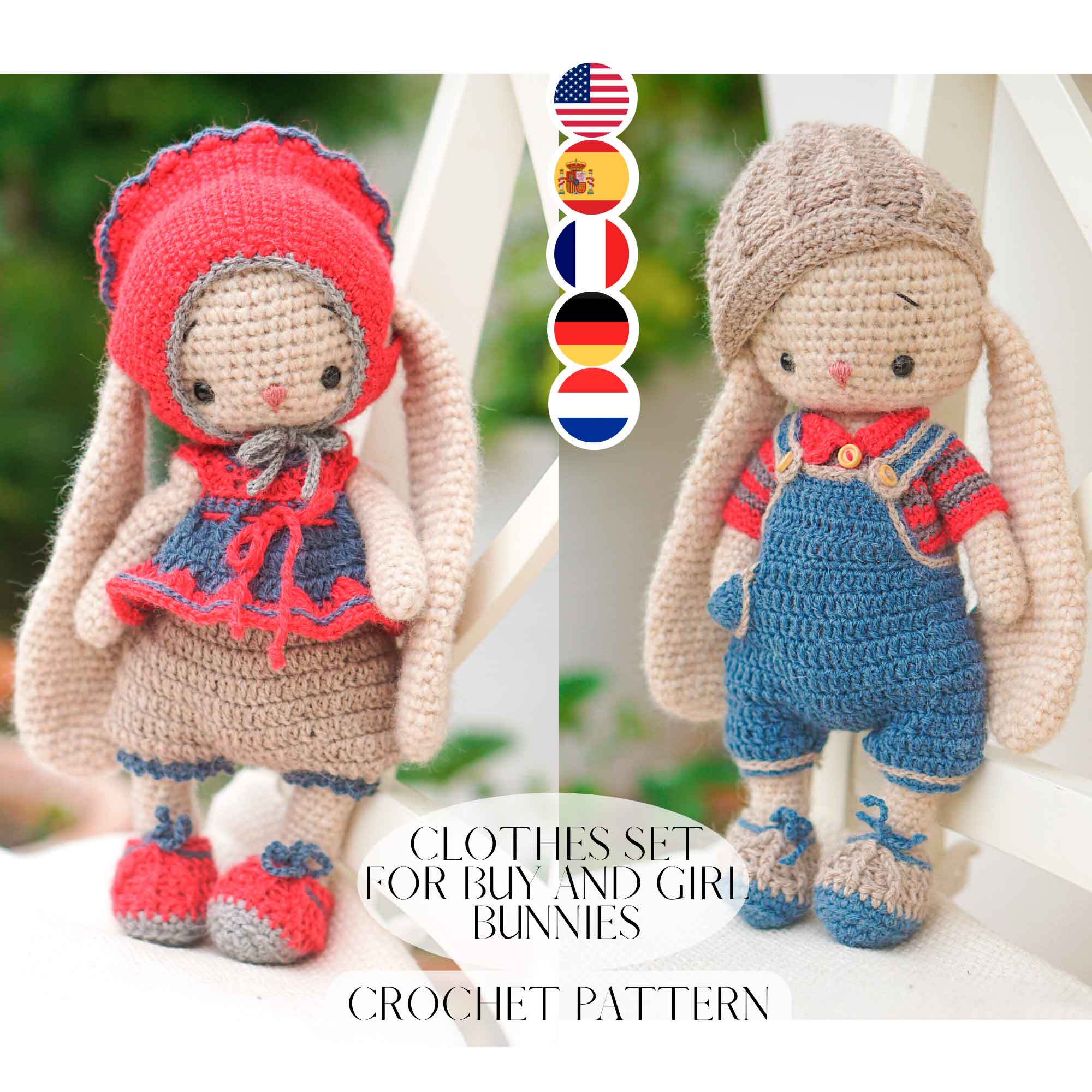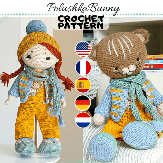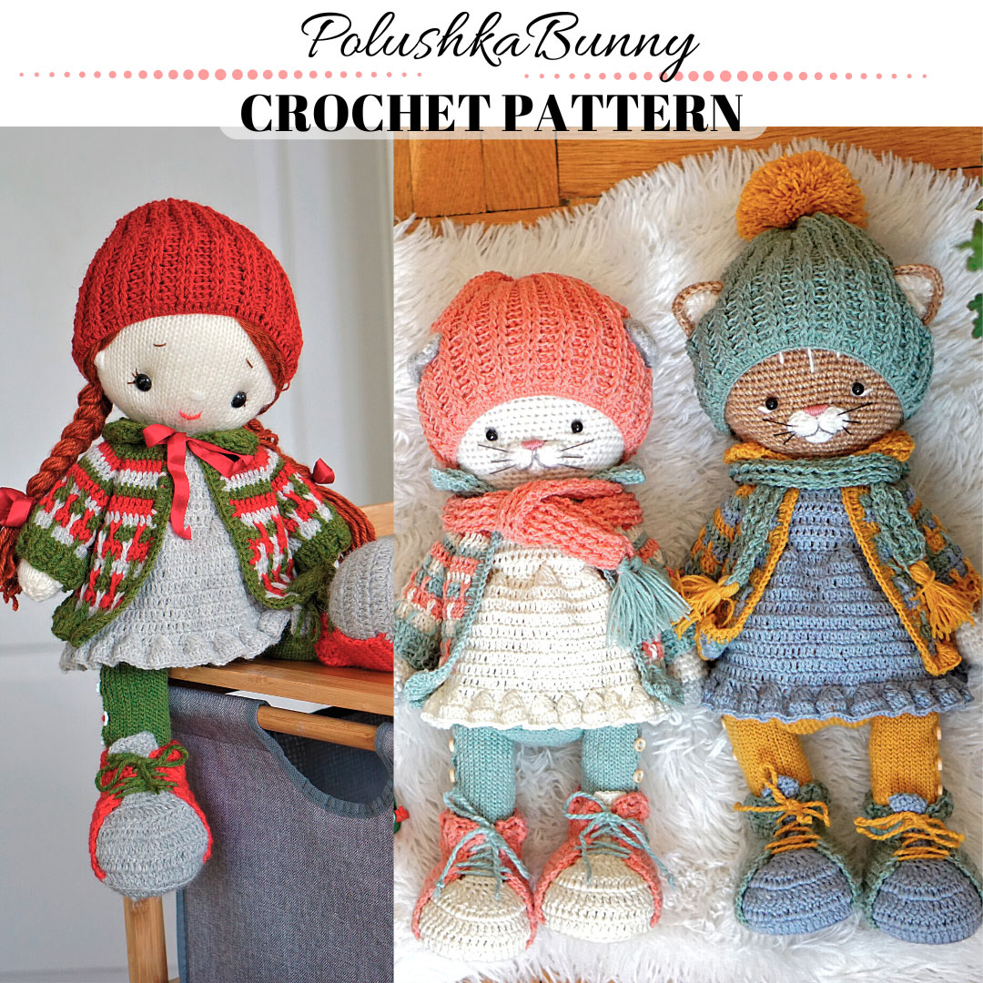 LARGE TOYS: bunny, doll, cat, dog, lamb, bear. The size of the finished toys is about 38cm/15''. You will find many lovely clothes for the large toys