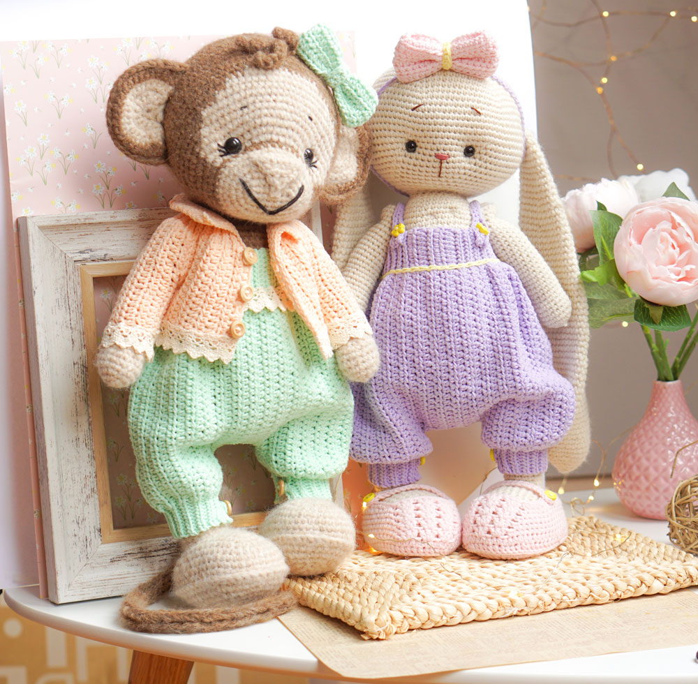 This crocheted clothes set fits large toys (crocheted and knitted bunny/cat/lamb/puppy/doll), includes:  dungarees - jacket - shoes - headband