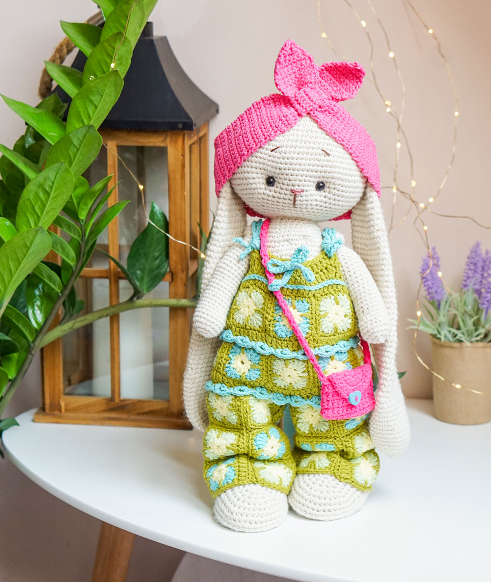 This charming set includes cozy granny square style dungarees, a cute headband, and a stylish crossbody bag, perfect for adding a touch of personality and fun to your beloved toys.