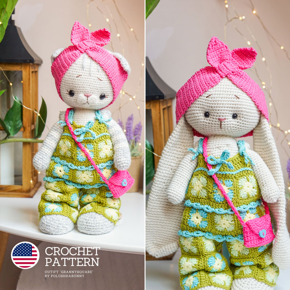 The "Granny Square" is an adorable clothing set designed to dress up your larger stuffed companions – think of those cuddly crocheted and knitted bunnies, cats, lambs, puppies, dolls, giraffes, tigers, and other large toys with a similar build.