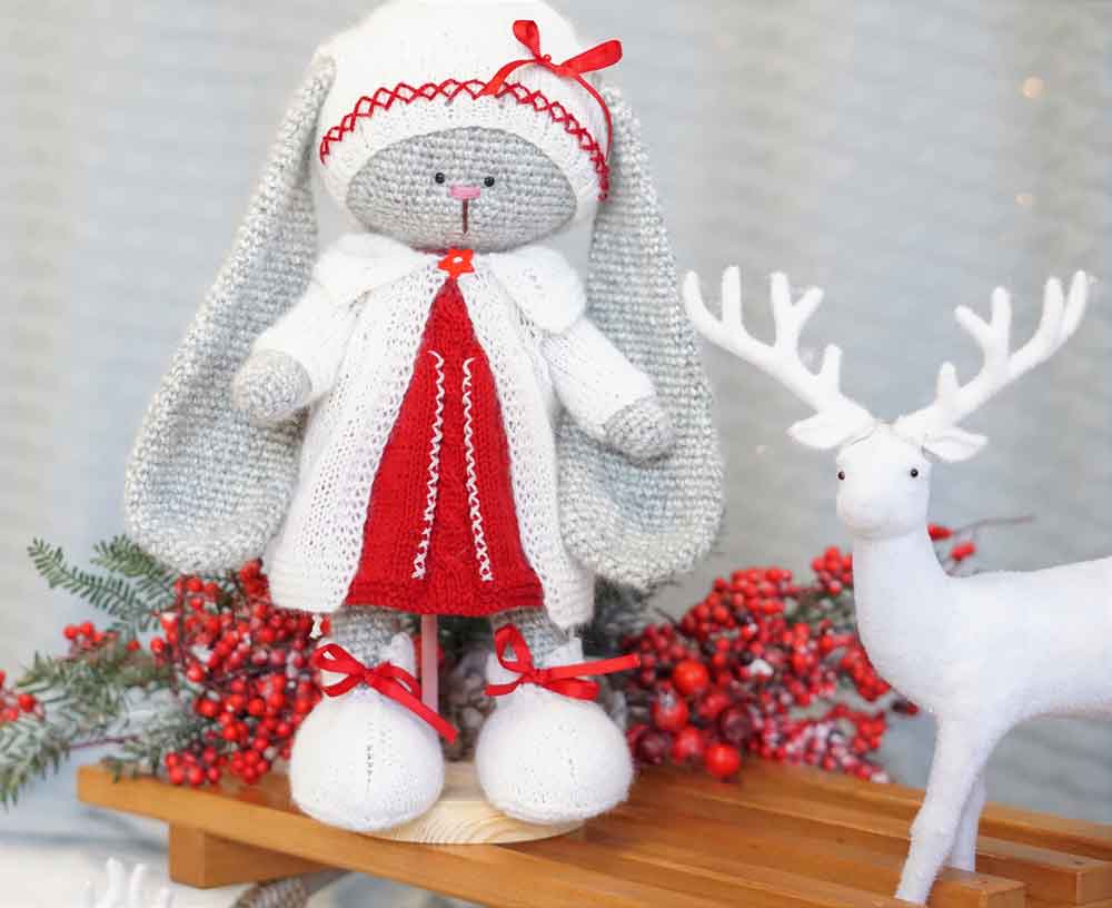 This outfit fits knitted and crocheted large toys by Polushkabunny that don't have upright ears