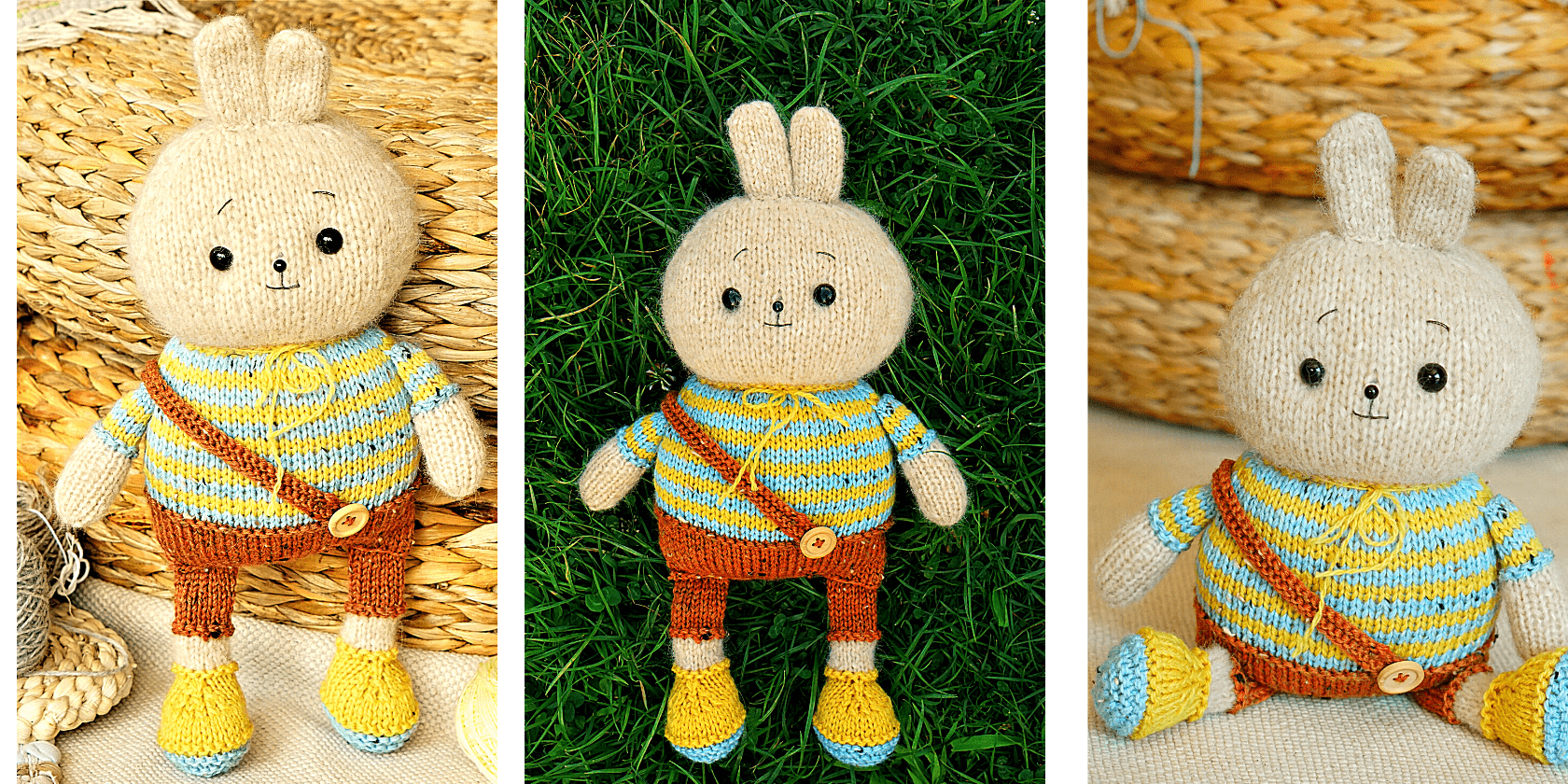 This is knitted flat and seamed bunny toy, you need a pair of knitting needles 3.5mm, sewing short needle and tapestry needle for assembling