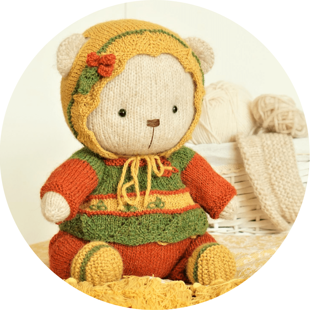 We start knitting with the head, going from neck up to the head top. Then goes the body. We will knit the arms, legs and finally, the ears. Now it is time to put the knitting needles aside and start sewing together and stuffing the details. A little more magic and..