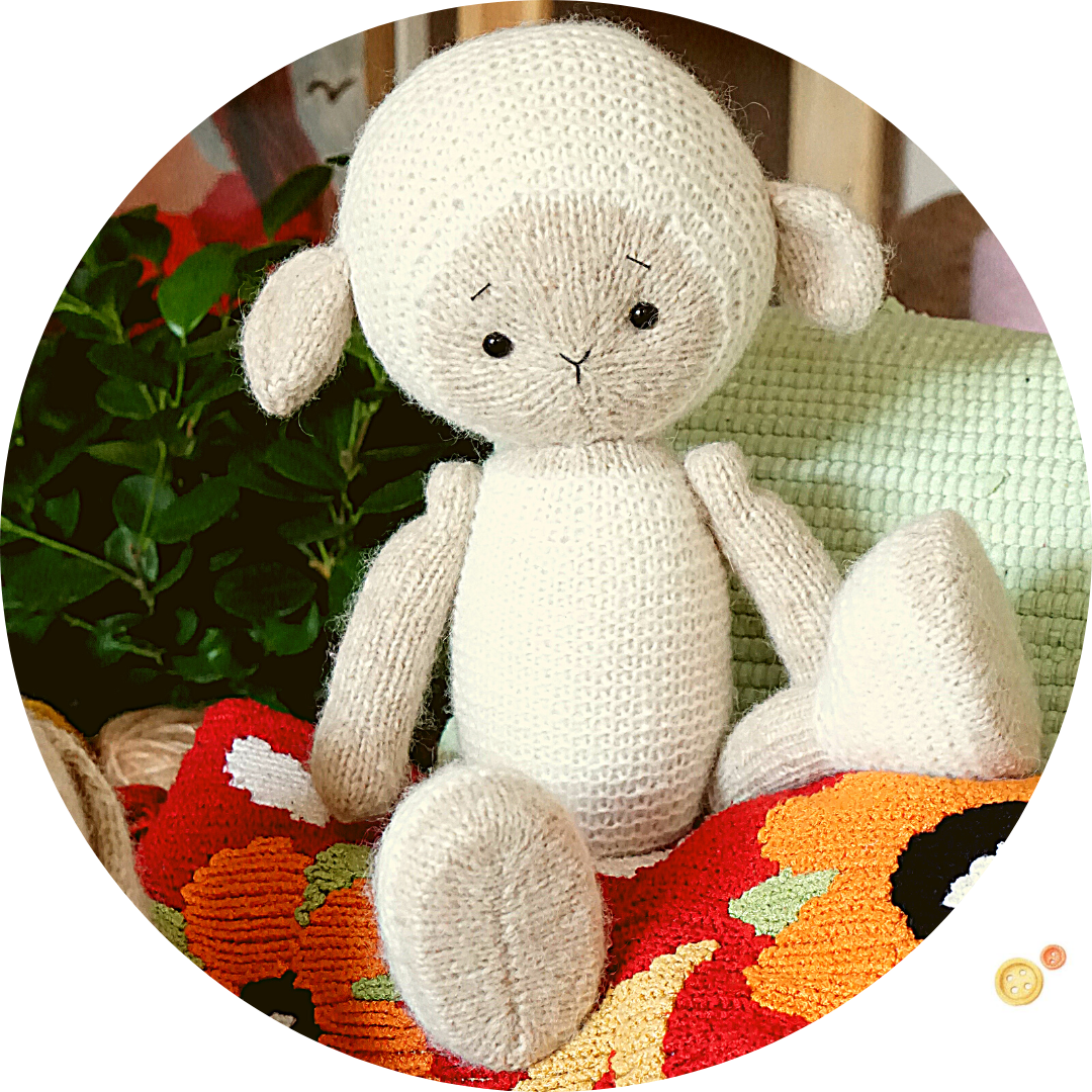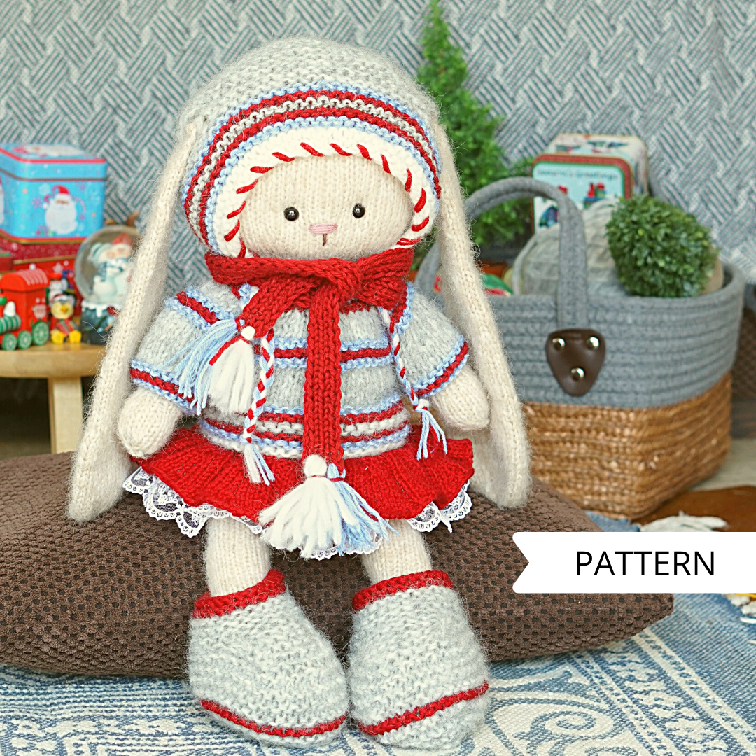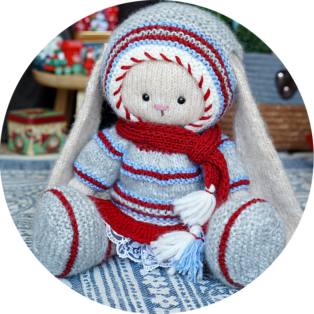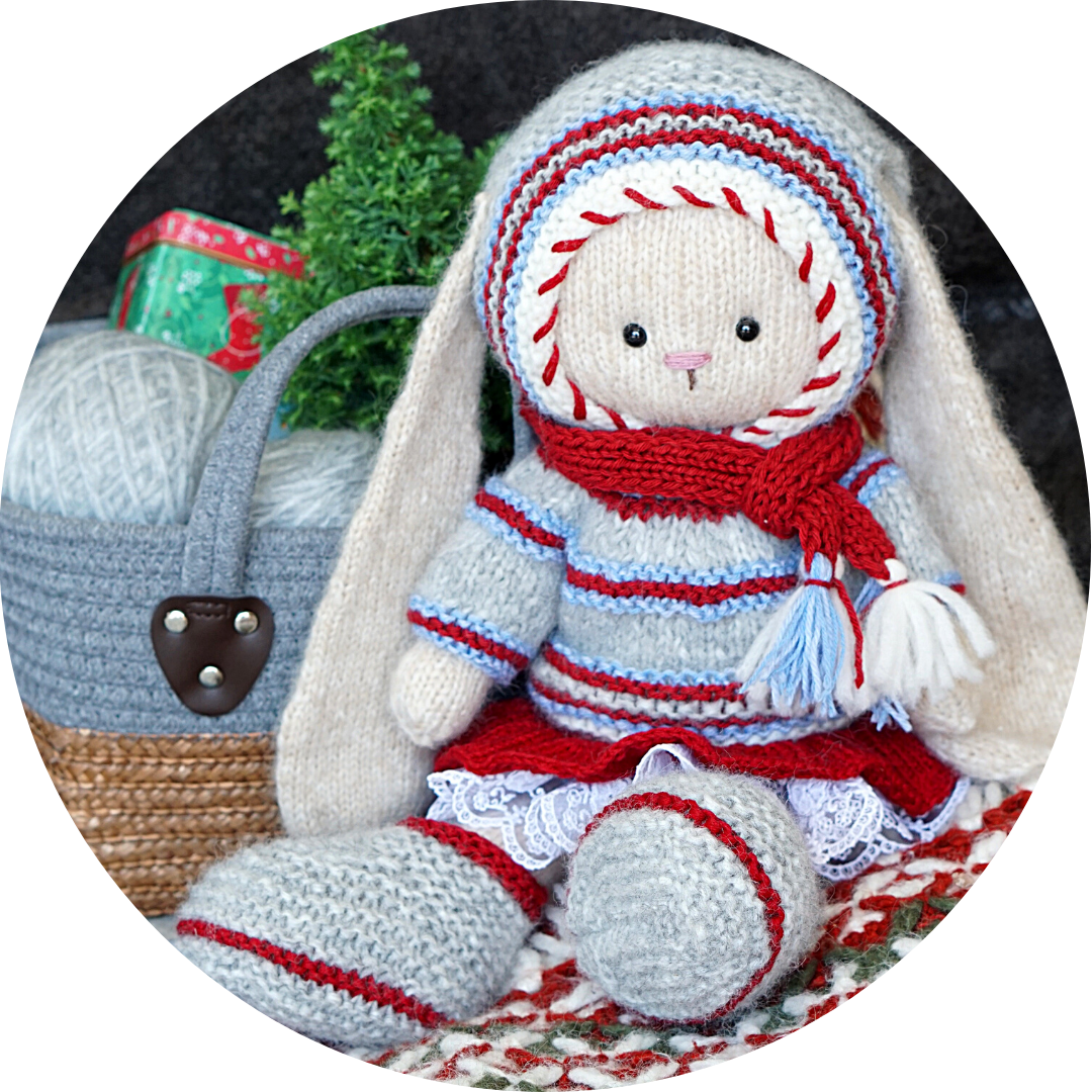 We use 2 knitting needles for this project, plus several different techniques. These are stockinette and garter stitch, color changing, ribbon embroidery and etc. Don’t forget to sew up the details. There is a sewinng process description in my pdf pattern.