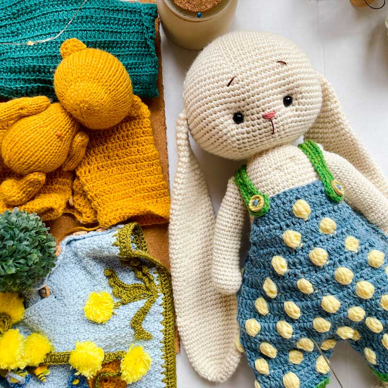 Там Вы найдёте список необходимых инструментов и материалов, все схемы на вязание, фото и видео материалы по сборке, набивке и оформлению игрушки.