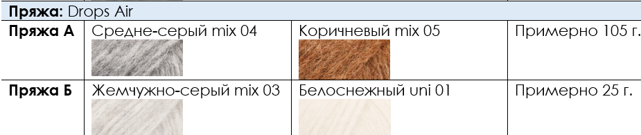 Варианты пряжи можете подбирать свои по заданному метражу, либо из моего списка (проверяйте плотность вязания):