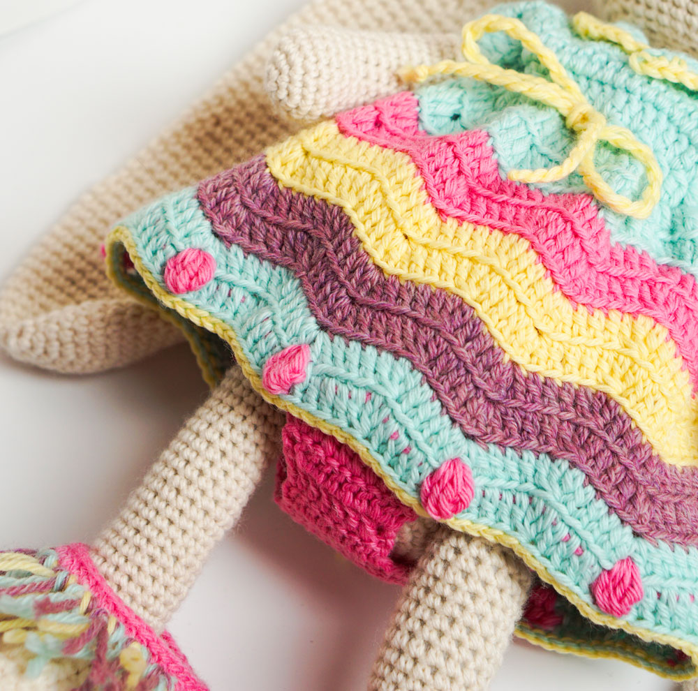 This crocheted clothes set fits large toys (crocheted and knitted bunny/cat/lamb/puppy/doll an other toys with the similar body shape), includes:  dress- boots- paints - headband